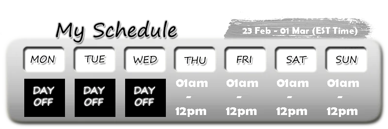Erotikus tánc, Flexing, Villantás, Cigizős, Ejakuláció, Mocskos beszéd, Lábfétis, Maszturbálás, Olajozás, Fenekelés, Farok értékelés, Dildo show (2000tkn+Pvt), Masszás, Orgazmus, Megalázás, Kiverési utasítások, CEI (gecinyalási utasítások), Élvezés, Ujjazás, Előváladék, Pumpa, SPH (kis pénisz miatti megalázás), Sztriptíz